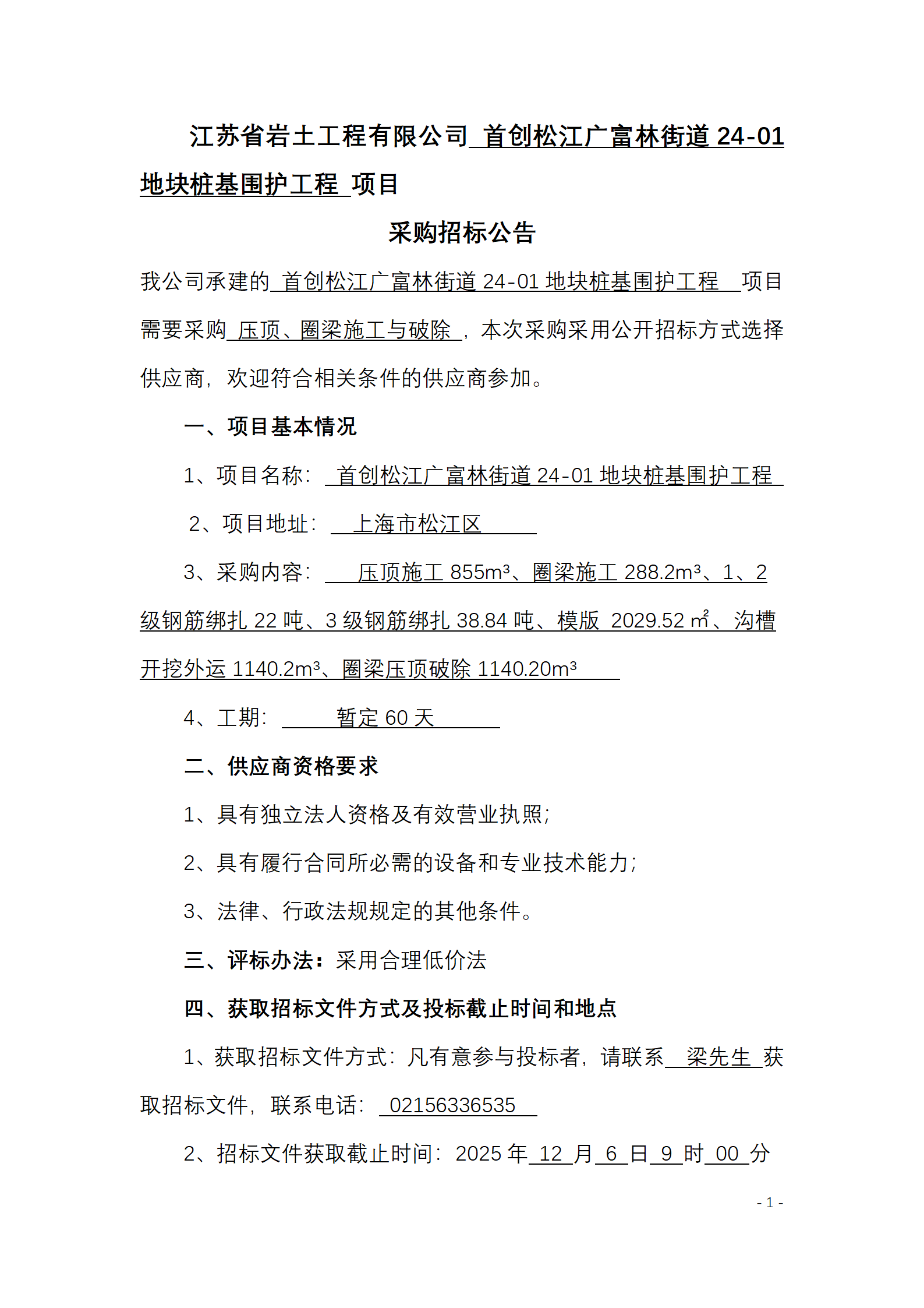 江苏省岩土工程有限公司 首创松江广富林街道24-01地块桩基围护工程项目采购招标公告.pdf