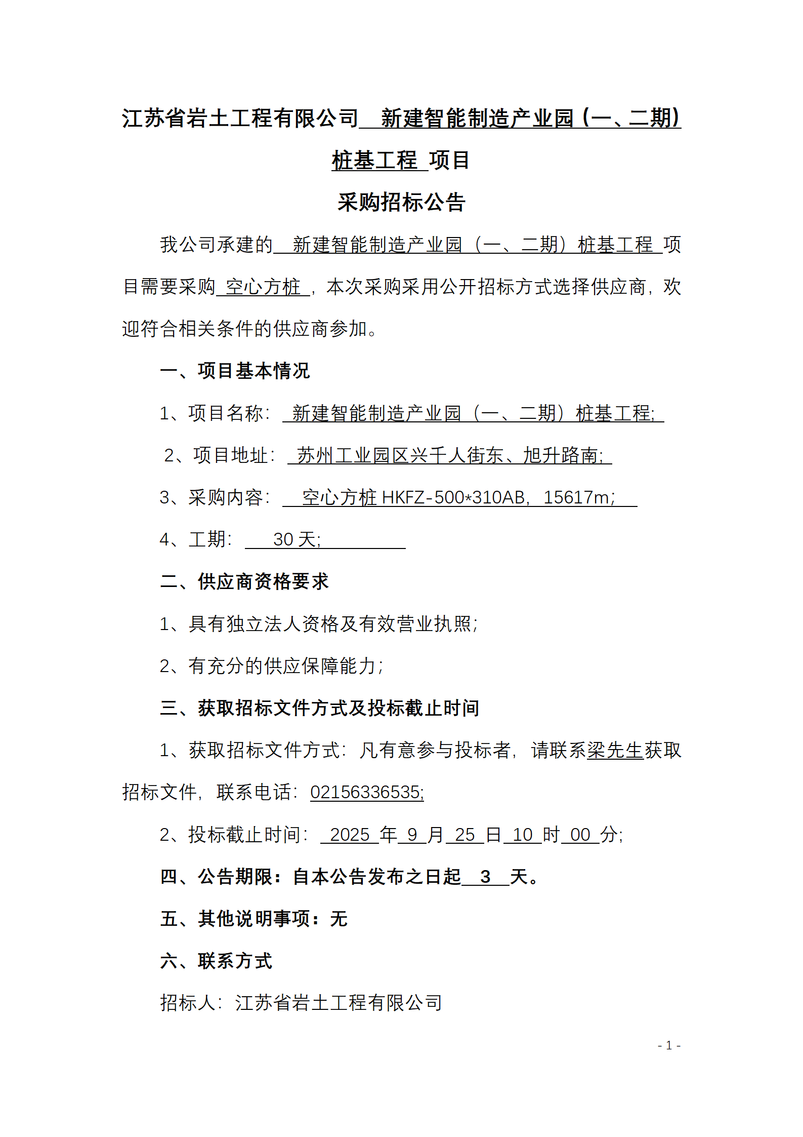江苏省岩土工程有限公司 新建智能制造产业园(一、二期)桩基工程项目采购招标公告.pdf