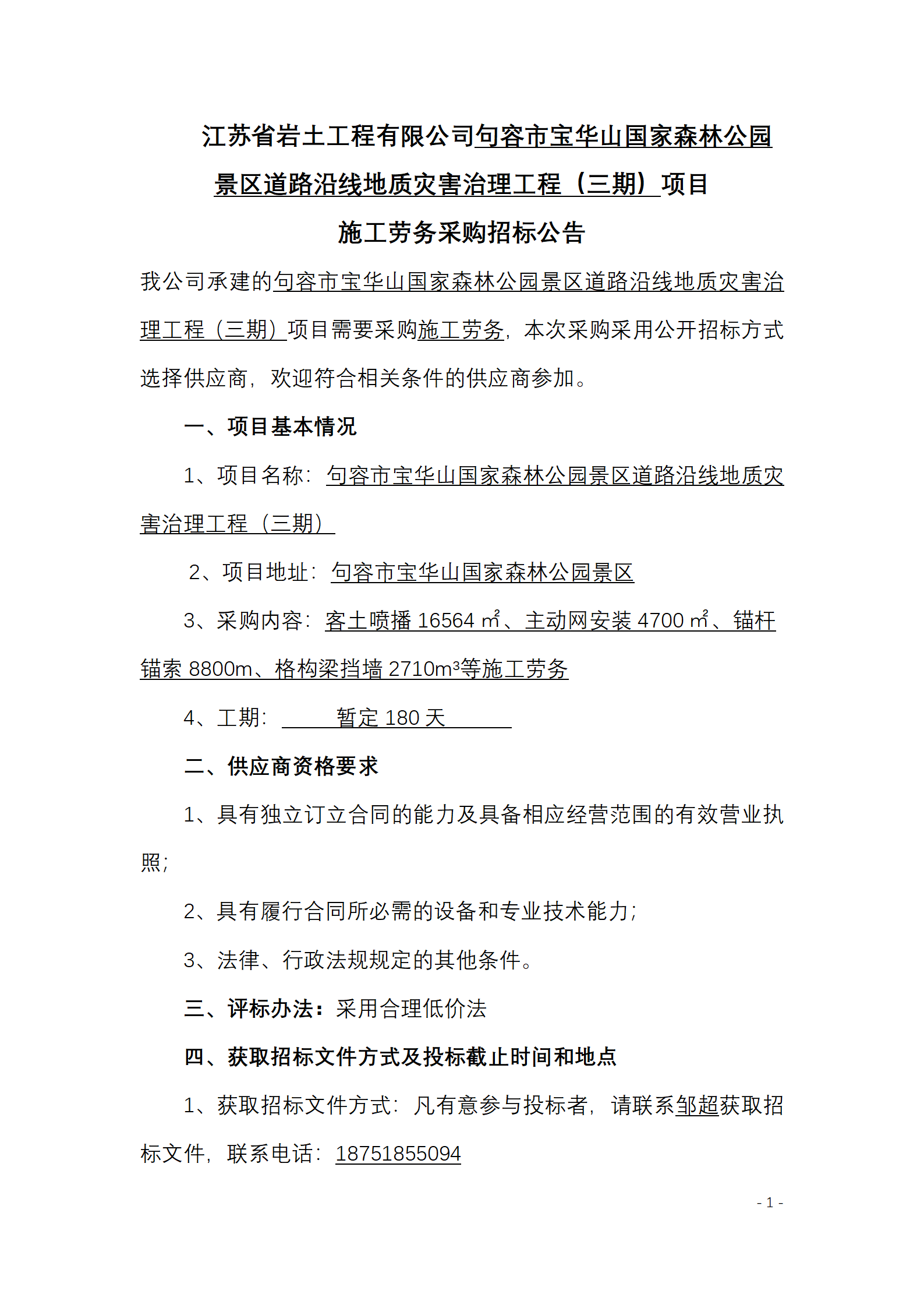 江苏省岩土工程有限公司句容市宝华山国家森林公园景区道路沿线地质灾害治理工程(三期)项目施工劳务采购招标公告.pdf