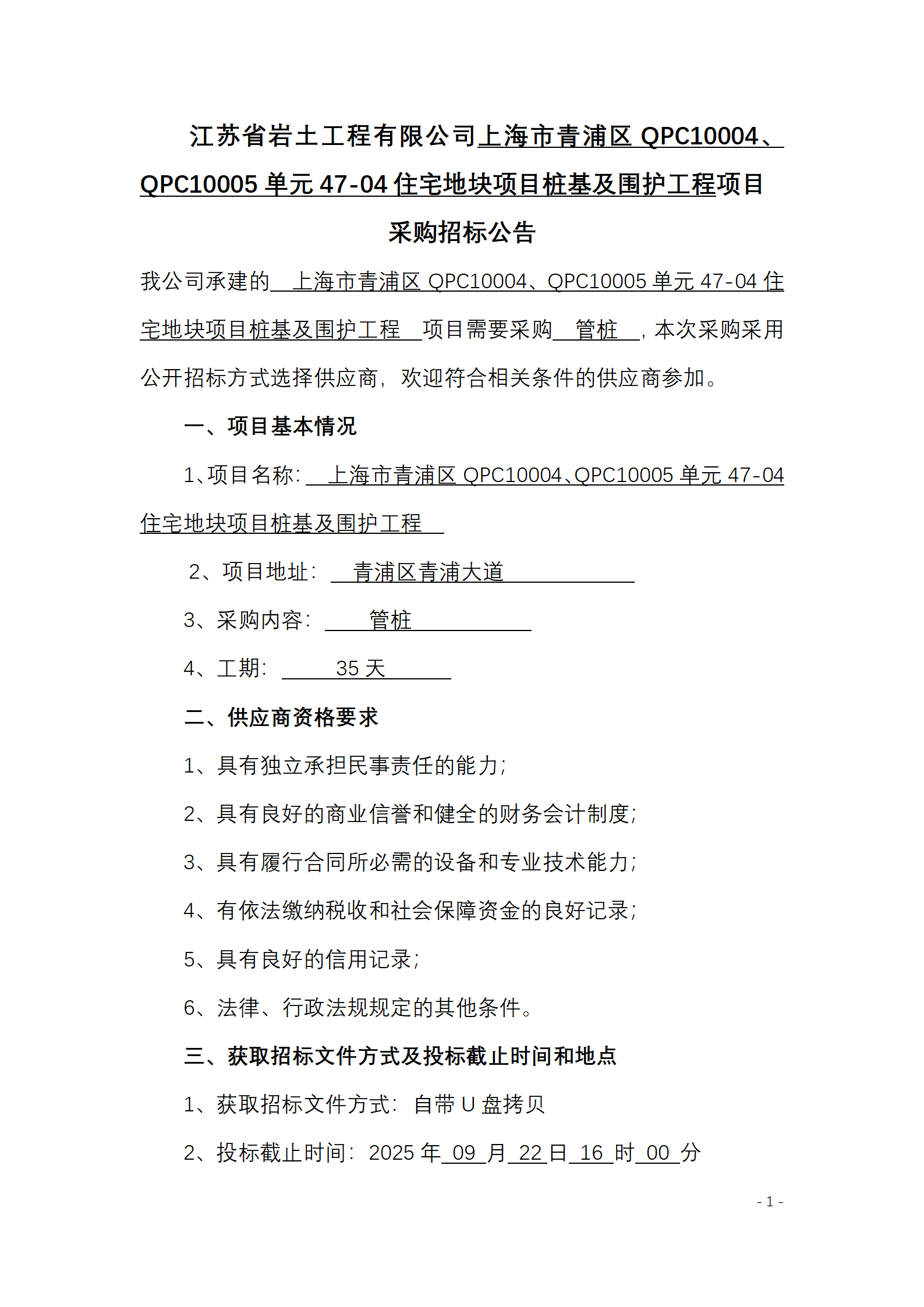 江苏省岩土工程有限公司上海市青浦区QPC10004、QPC10005单元47-04住宅地块项目桩基及围护工程项目采购招标公告.pdf