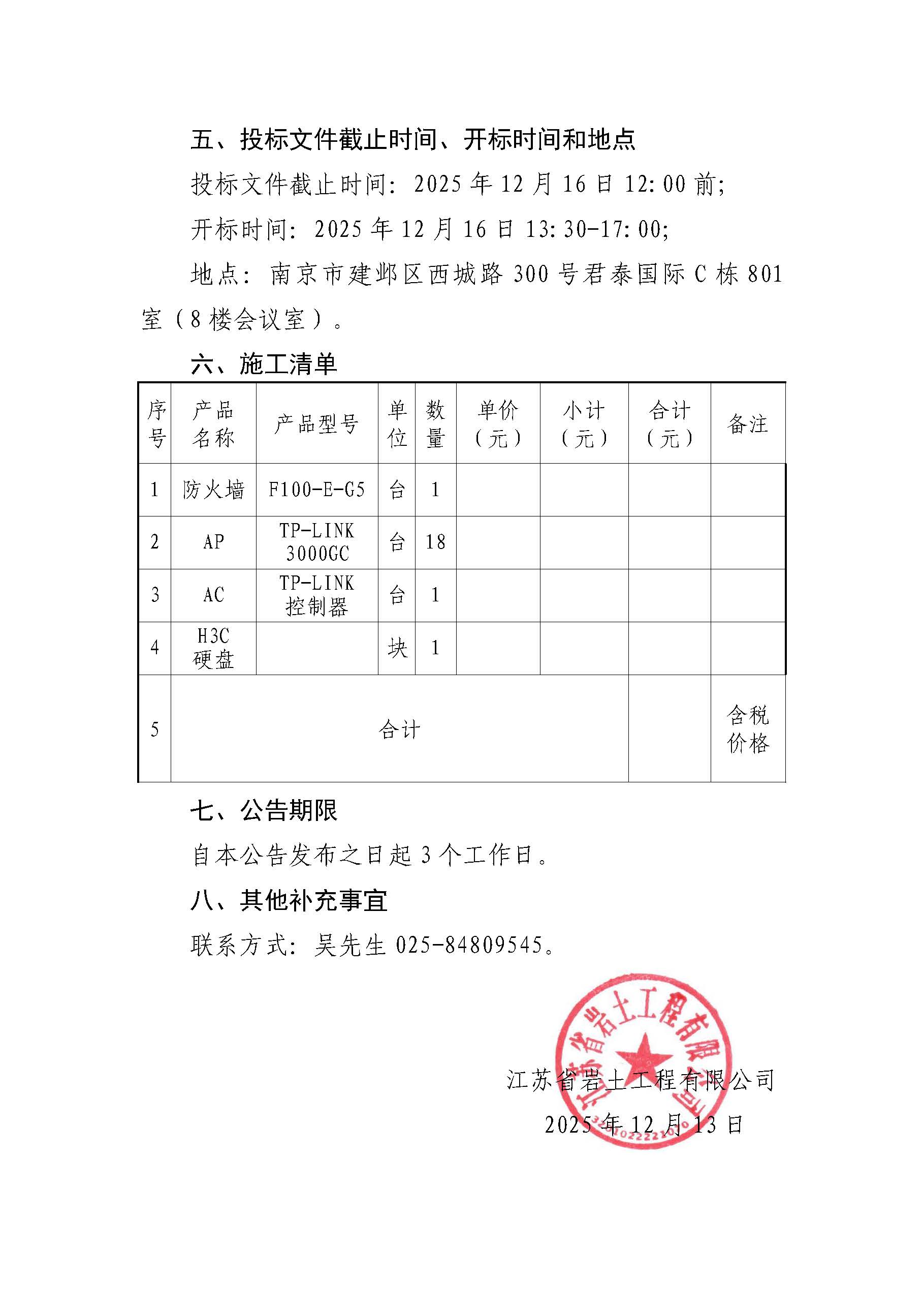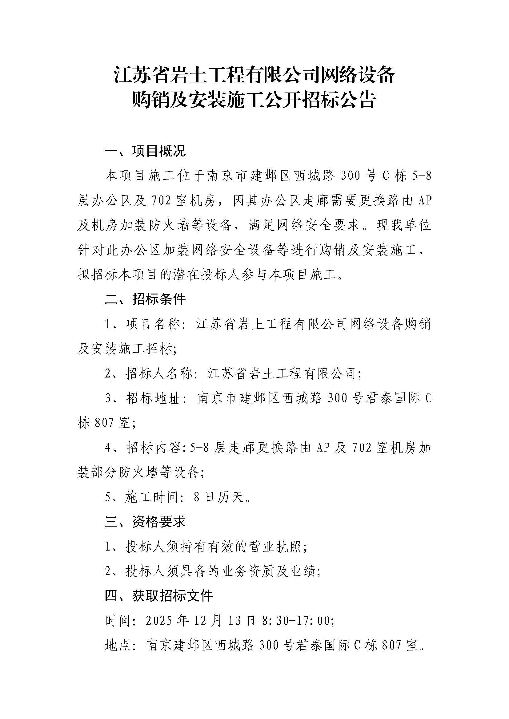 江苏省岩土工程有限公司网络设备购销及安装施工公开招标公告