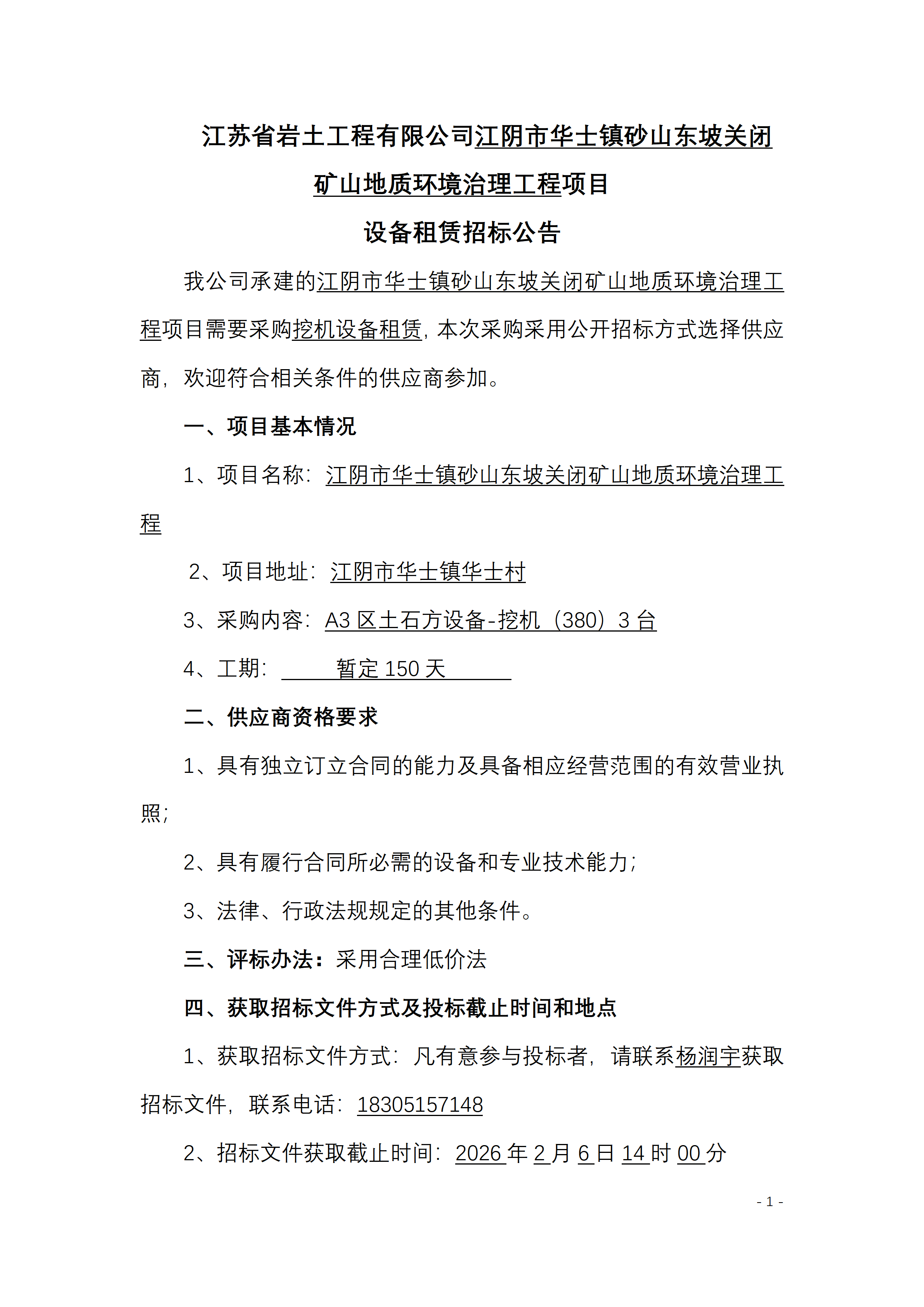 江苏省岩土工程有限公司江阴市华士镇砂山东坡关闭矿山地质环境治理工程项目设备租赁招标公告