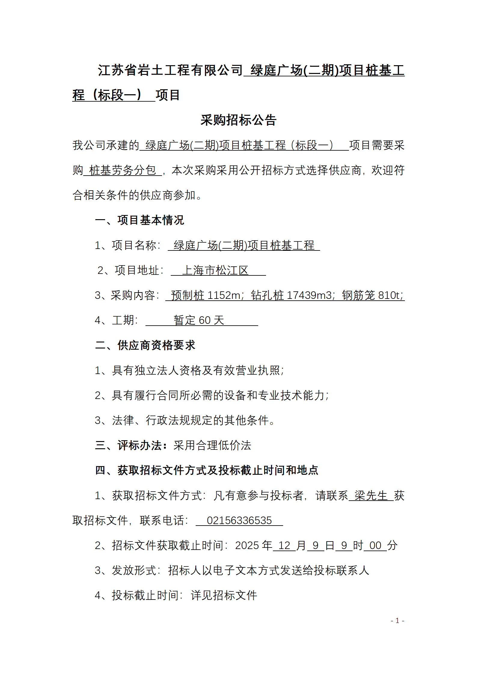 江苏省岩土工程有限公司 绿庭广场(二期)项目桩基工程(标段一) 项目采购招标公告.pdf