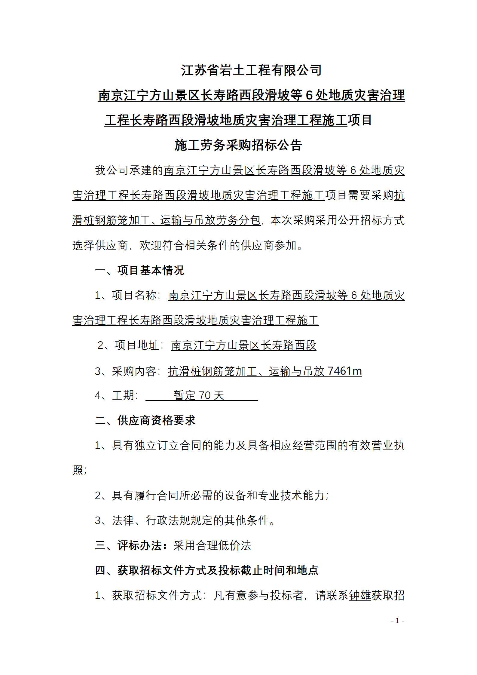 江苏省岩土工程有限公司南京江宁方山景区长寿路西段滑坡等6处地质灾害治理工程长寿路西段滑坡地质灾害治理工程施工项目施工劳务采购招标公告.pdf