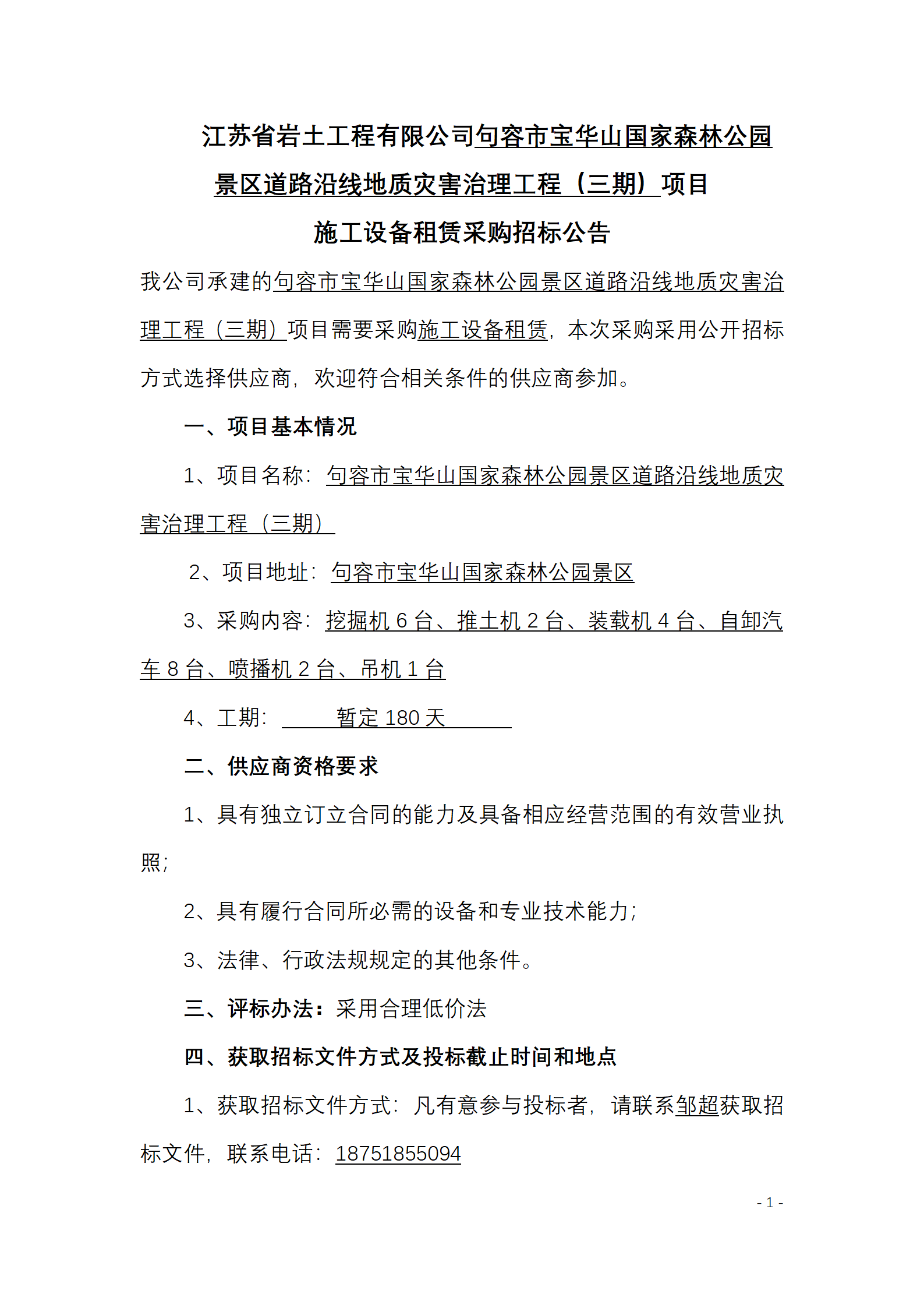 江苏省岩土工程有限公司句容市宝华山国家森林公园景区道路沿线地质灾害治理工程(三期)项目施工设备租赁采购招标公告.pdf