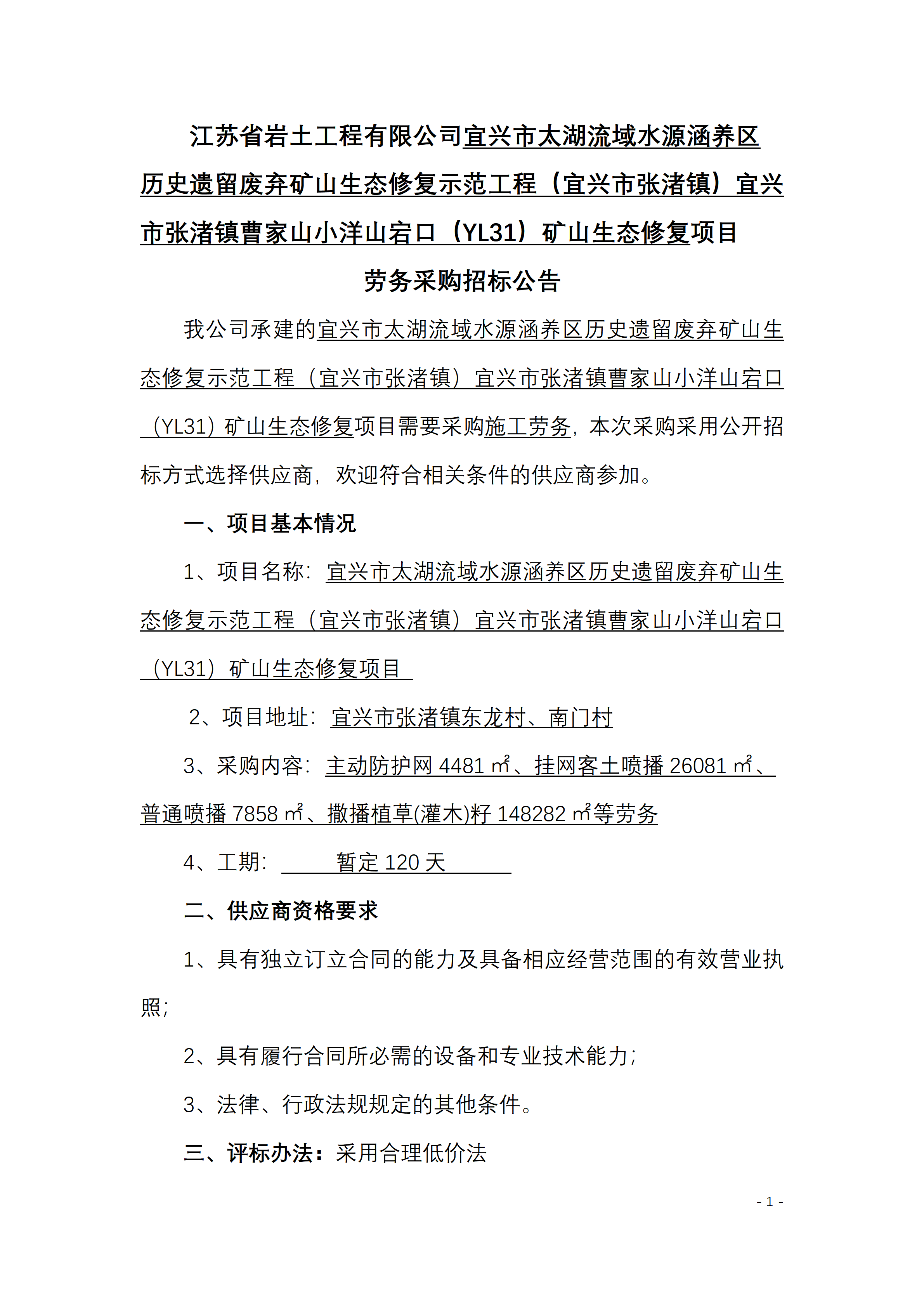 江苏省岩土工程有限公司宜兴市太湖流域水源涵养区历史遗留废弃矿山生态修复示范工程(宜兴市张渚镇)宜兴市张渚镇曹家山小洋山宕口(YL31)矿山生态修复项目劳务采购招标公告.pdf